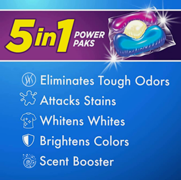 • NO MEASURING, MESS OR SPILLS: convenient pre-measured laundry pods combine concentrated clean laundry detergent with stain remover plus Odor Booster in a single pak. Use two Power Paks for large, heavily soiled loads or tough odors; use one Power Pak for regular or lightly soiled loads