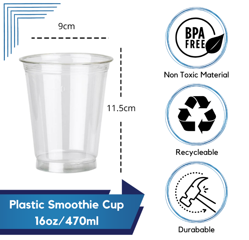 • 16oz (470cc) Clear Smoothie Cups and Domed or Flat Lids