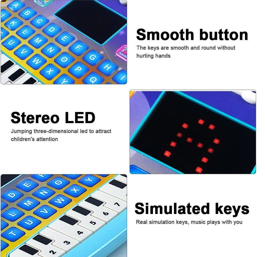 Kids Tablet Toys With LED Light & Music. features the smooth emulational piano keys. Press the piano key to play piano tunes.