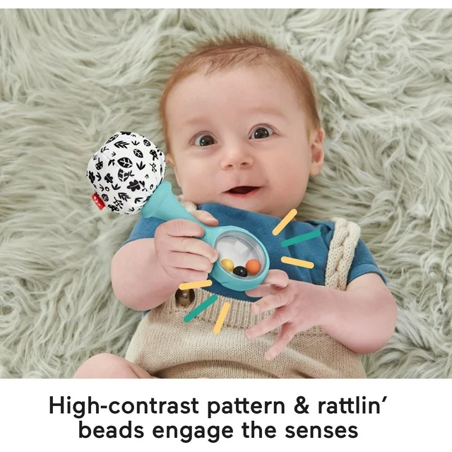 The Fisher-Price Rock ‘n Rattle Maracas are just the right size for your baby's little hands to shake, rattle, and rock! With soft, fabric pom-poms in high-contrast patterns and colorful beads that make fun rattle sounds, these maracas will get your little one rattling and rocking to the beat in no time. The high-contrast colors, textures, and rattle sounds engage and delight your baby's developing senses, while all that shaking and rattling action gives their gross motor skills a great workout.