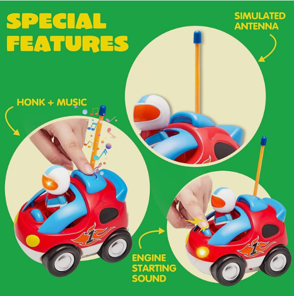 • Race Car Radio Control Toddler Cars Includes 2 Cartoon Radio Control Race Cars with Music and Sound Features, 2 Different Removable Action Figures and 2 Remote Controls with Forward and Reverse Left Channels.