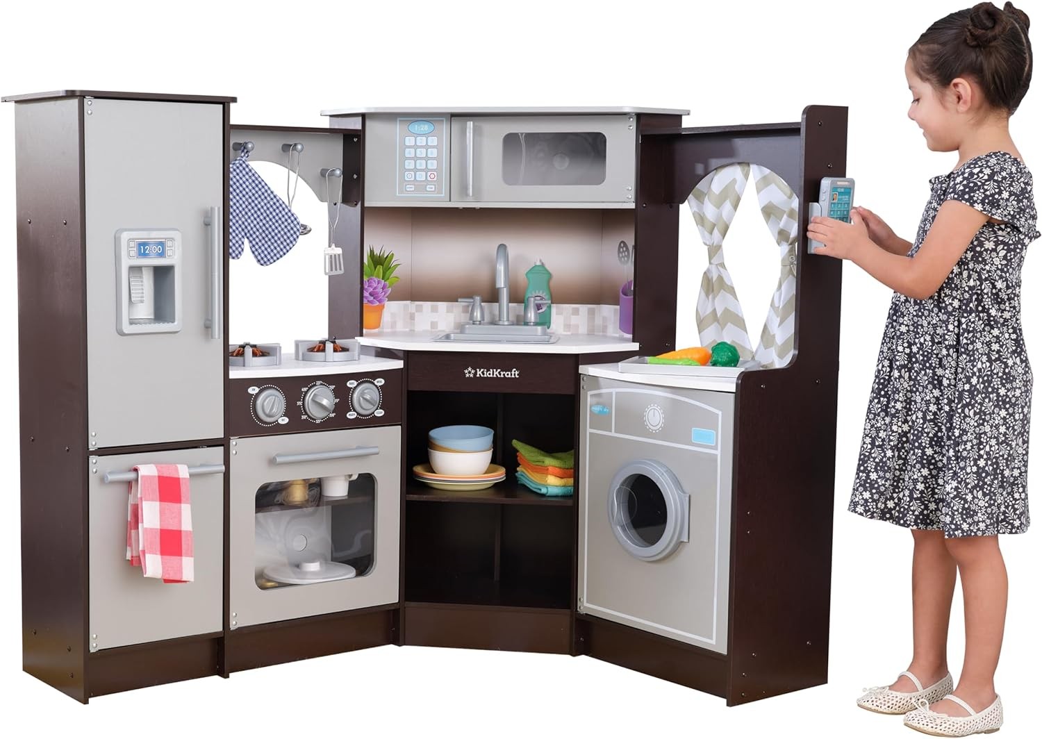 KidKraft Ultimate Corner Wooden Play Kitchen with Lights & Sounds, Play Phone and Curtains, Espresso, Gift for Ages 3+