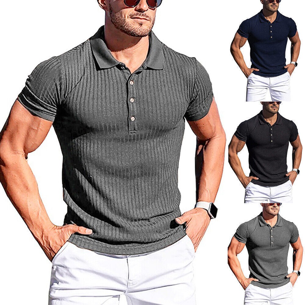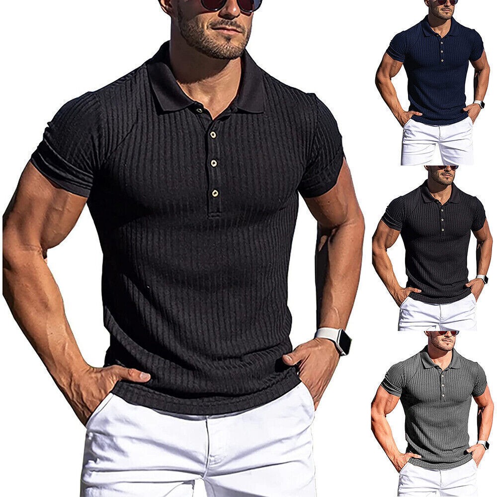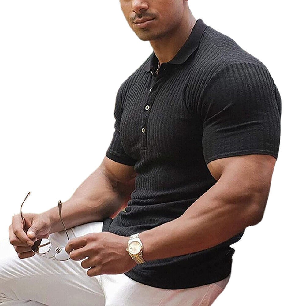 Men Short Sleeve Ribbed Muscle Polo Shirt Casual Slim Fit Stretch T-Shirt Top